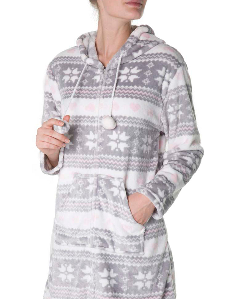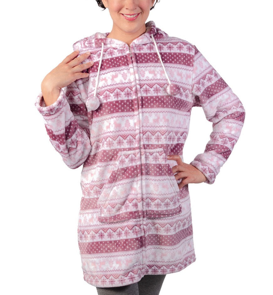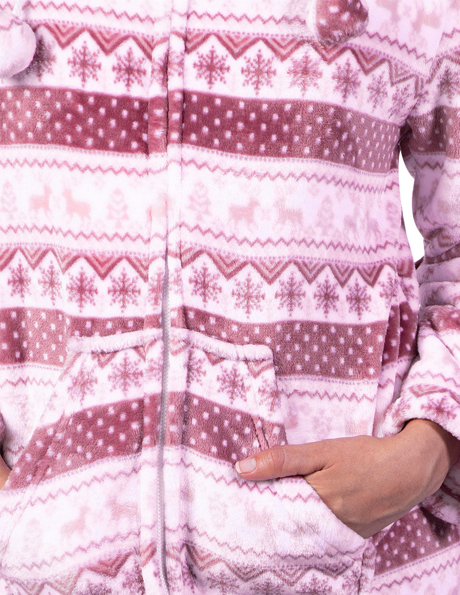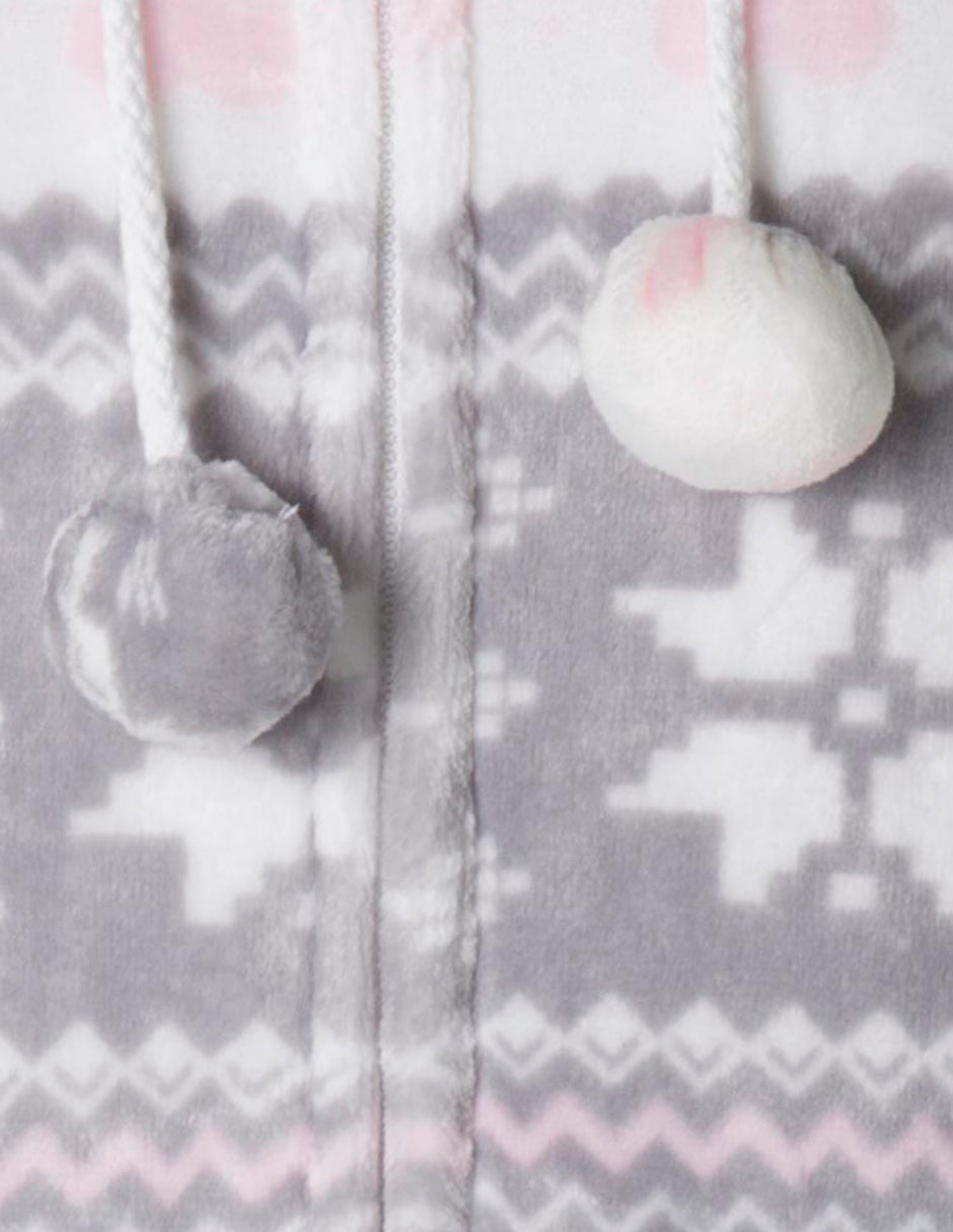 Chaqueta de suave tela microfleece con diseño nórdico. Capucha abrigadora y jareta con pompones para autoajuste. Cómodos bolsillo laterales.