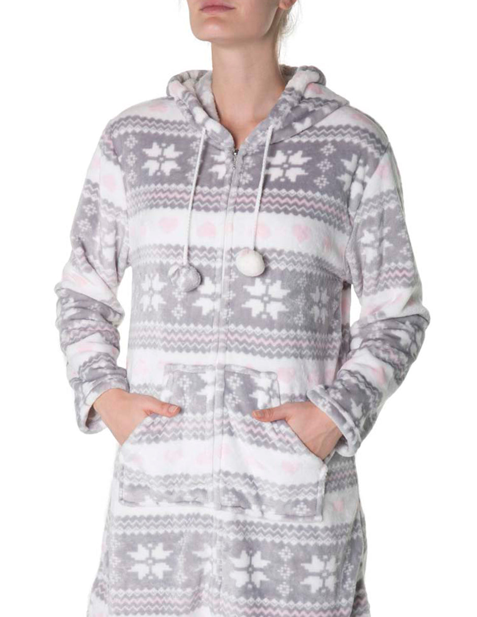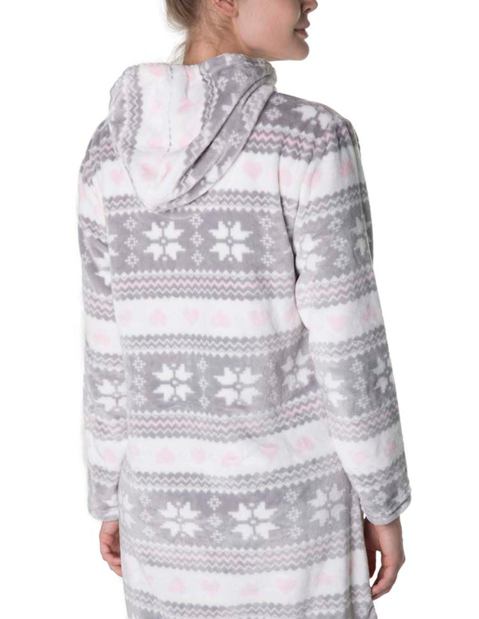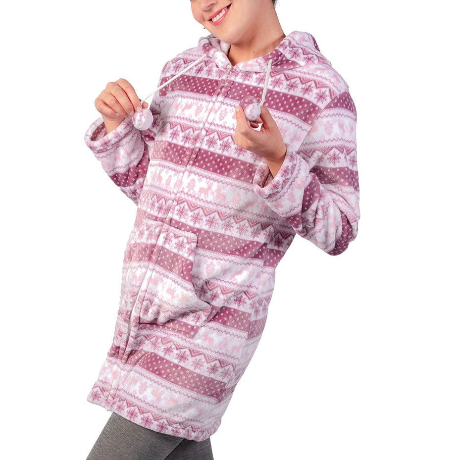 Chaqueta de suave tela microfleece con diseño nórdico. Capucha abrigadora y jareta con pompones para autoajuste. Cómodos bolsillo laterales.
